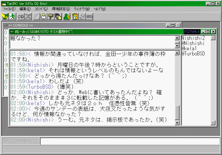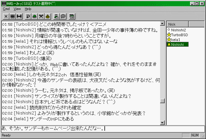 ここでは、「るーみっくSIG」チャンネルのチャットへ入る説明をしていますが、ここでの解説内容は他のどんなチャンネルに入る場合でも同様に使えます。 ぜひ試してみて下さい。