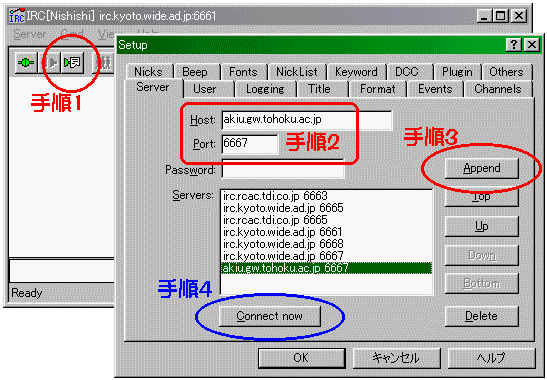 ※指定できるサーバとポートの一覧は、国内 IRC サーバリストを参照して下さい。上記以外にもあります。