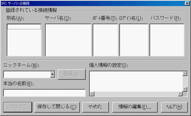 下図のような「IRCサーバへの接続」というダイアログが表示されます。(起動直後なら自動的に表示されます)